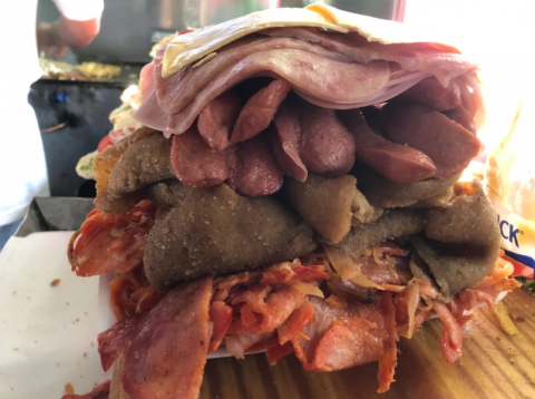 Y sí, es tan grande como cuenta la leyenda. Entre mi chico y yo, no logramos terminarnos ni la mitad. Me parece prácticamente imposible que alguien haya podido terminarse completo este monstruo en el que las capas de carne y otros ingredientes parecen no tener fin.