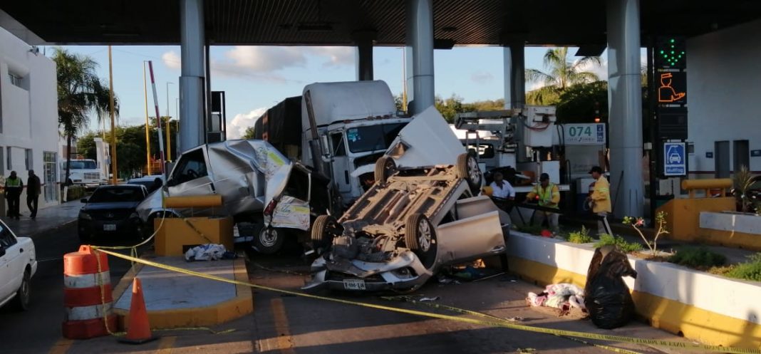 CULIACÁN, Sin.- Dos heridos fue el saldo al quedarse un tráiler cargado de fertilizante sin frenos e impactarse contra dos vehículos estacionados en la fila de espera de la caseta de cobro de El Limón de los Ramos.