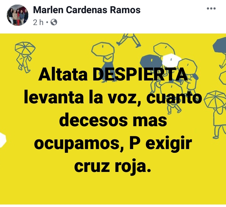 A través de su cuenta de Facebook la activista del grupo ciudadano Pro Altata, Marlén Cárdenas Ramos, llamó a los altateños a sumarse a los reclamos de una base prometida por el alcalde Eliazar Gutiérrez Angulo en marzo pasado.