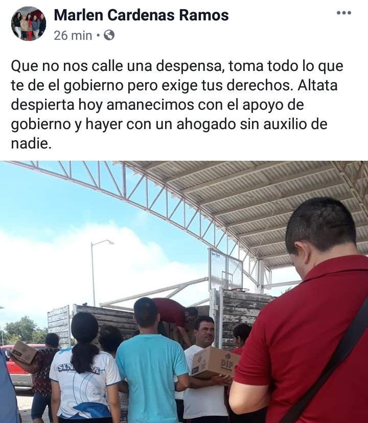 En una segunda publicación Cárdenas Ramos hizo este martes acusaciones sobre un reparto de despensas por parte del gobierno local en medio de la tragedia.