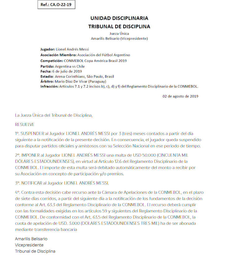 CIUDAD DE MÉXICO.- La Conmebol hizo oficial este viernes la sanción a Messi por sus duras declaraciones contra la Conmebol tras su expulsión ante Chile en el tercer y cuarto puesto de la Copa América, en las que acusaba al máximo organismo de manejar todo a favor de Brasil.