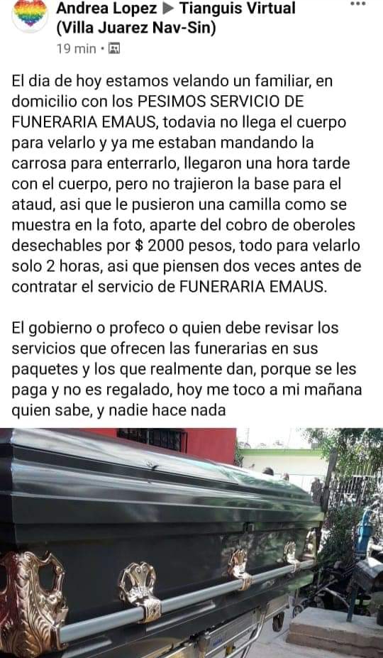 NAVOLATO, Sin.- Una funeraria local fue acusada de pésimos servicios y altos costos en medio de la pandemia por coronavirus.