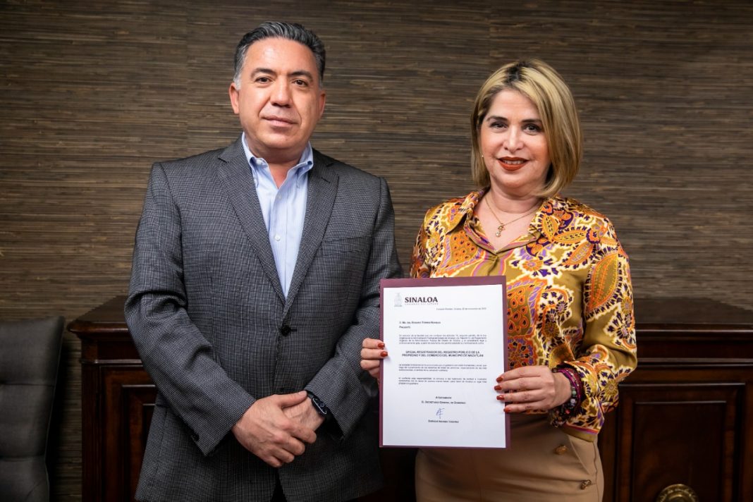 CULIACÁN, Sin.- Por instrucciones del gobernador Rubén Rocha Moya, el secretario general de Gobierno, Enrique Inzunza Cázarez, tomó protesta a Rosario Torres Noriega como oficial registradora del Registro Público de la Propiedad y el Comercio en el municipio de Mazatlán.
