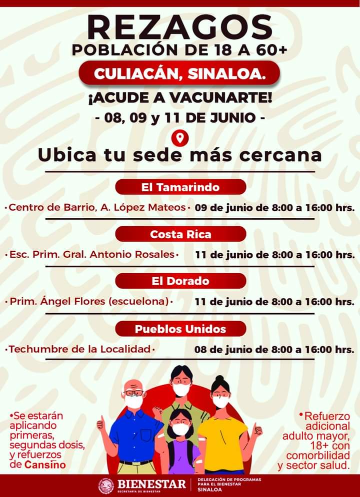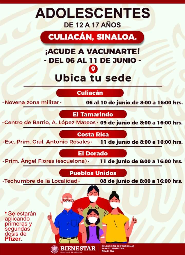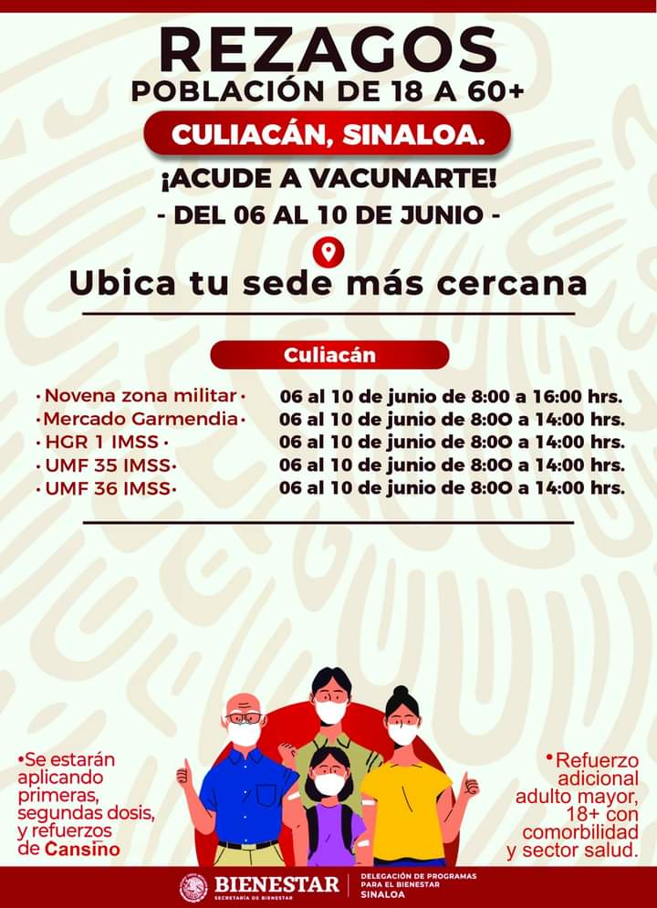 CULIACÁN, Sin.- Se estarán aplicando primeras dosis Pfizer a toda la población de 12 a 14 años, primeras y segundas dosis de 15 a 17 años, así como primeras, segundas dosis, y refuerzos Cansino a la población de 18 a 65+.