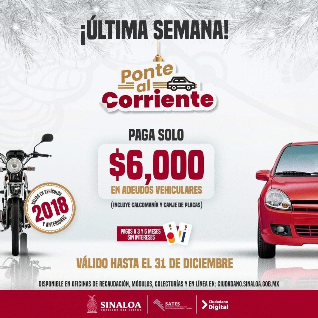 CULIACÁN, Sin.- No dejes pasar esta oportunidad. Tienes hasta el próximo miércoles 31 de diciembre para aprovechar el programa Ponte al Corriente y liquidar tu adeudo vehicular con una sola cantidad de $6,000.