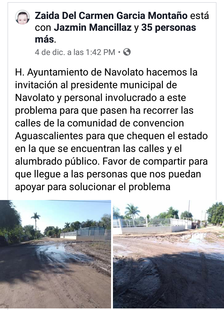 Vialidades y alumbrado público en mal estado son las peticiones donde invitan al alcalde a recorrer las calles y constatar el estado que guarda la comunidad a un año de la administración PT-PES-Morena.