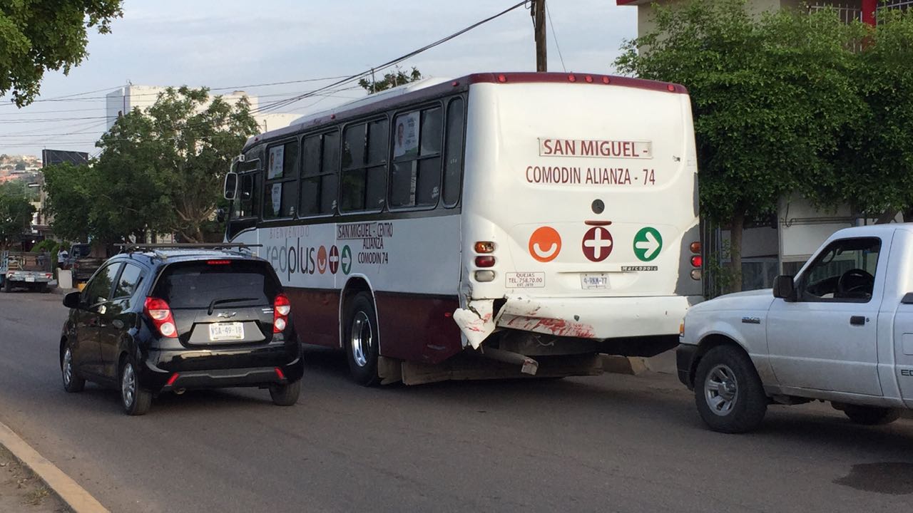 CULIACÁN, Sin.- Dos camiones urbanos de la ruta San Miguel en Culiacán terminaron impactados tras disputarse el pasaje la mañana de este viernes.