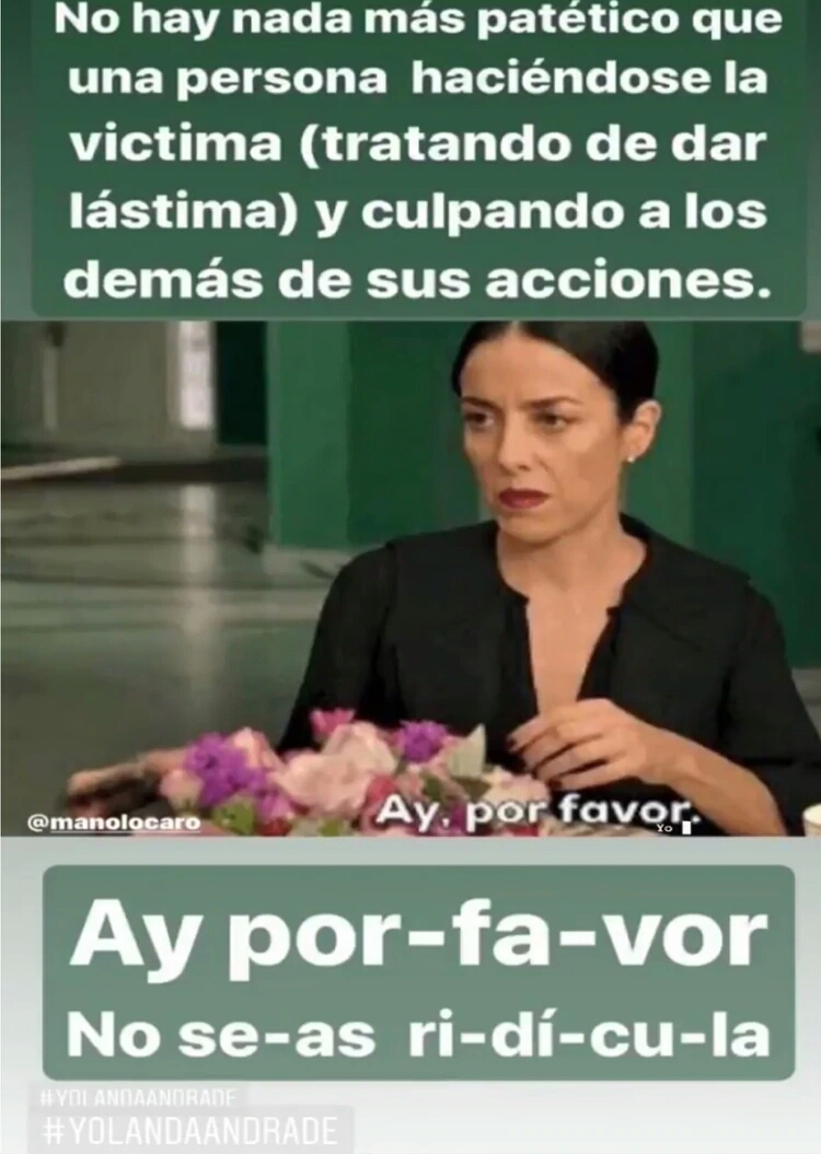 “No hay nada más patético que una persona haciéndose la víctima (tratando de dar lástima) y culpando a los demás de sus acciones.” escribió en su red social etiquetando a la cuenta de Manolo Caro y con el hashtag Yolanda Andrade. Además, en un intento de imitar la característica voz de De La Mora, separó la típica frase “Ay por-fa-vor. ¡No se-as ri-dí-cu-la!“, añadió a la publicación.