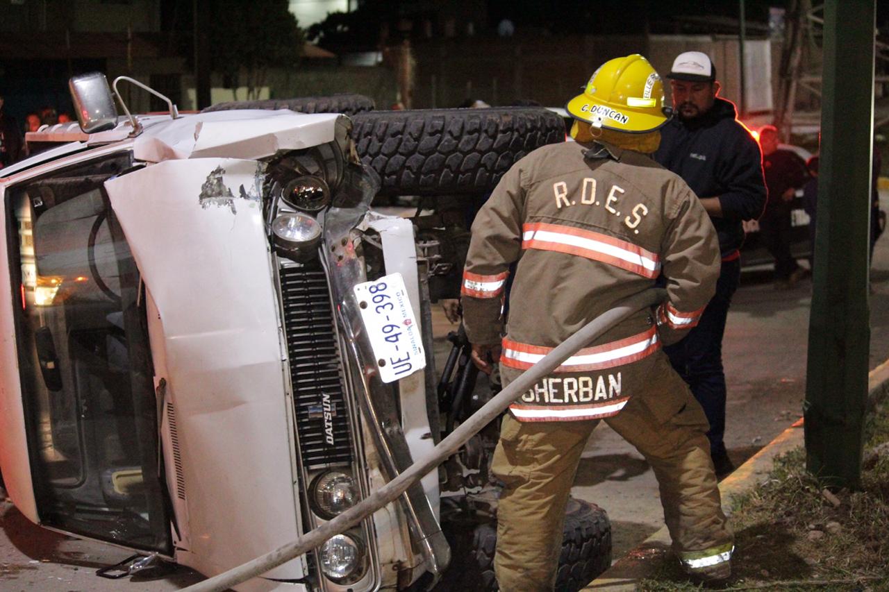 CULIACÁN, Sin.- Un conductor perdió el control de su camioneta y terminó volcándose tras impactarse contra un poste de energía eléctrica en la colonia 21 de Marzo.