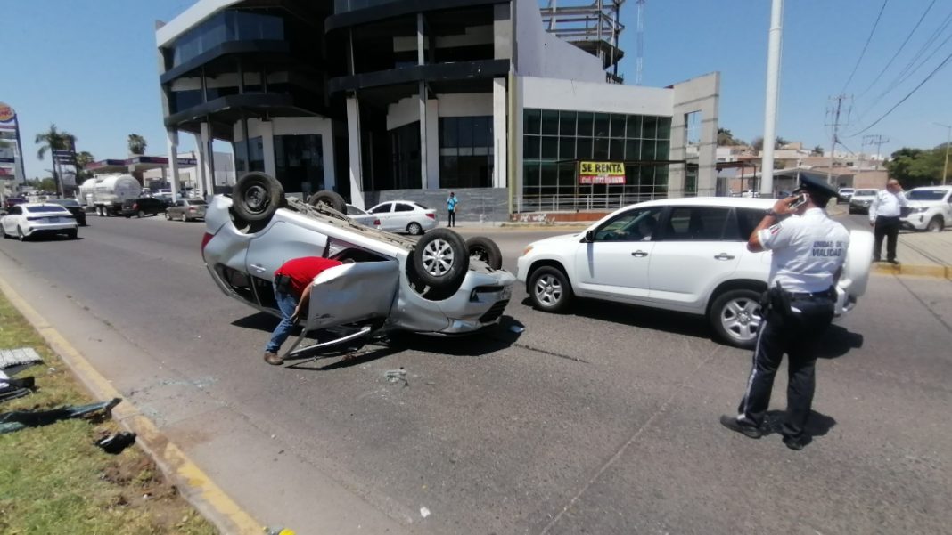 CULIACÁN, Sin.- Un automóvil terminó volcado tras un presunto choque con otra unidad sobre la avenida Álvaro Obregón de Culiacán a la altura del Tec de Culiacán.