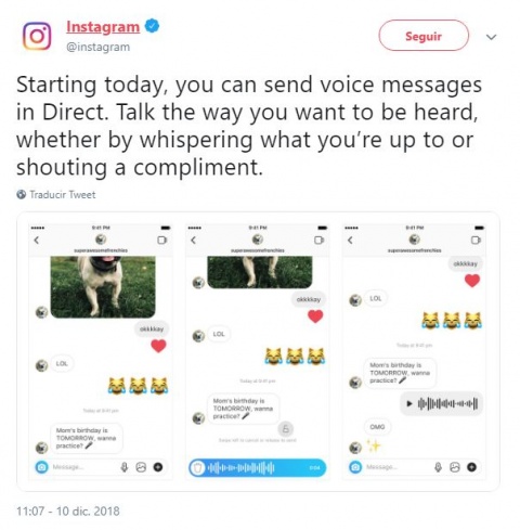 Según una publicación en Twitter, ya se pueden intercambiar mensajes de voz en los mensajes directos de hasta un minuto de duración, en conversaciones privada o grupales.